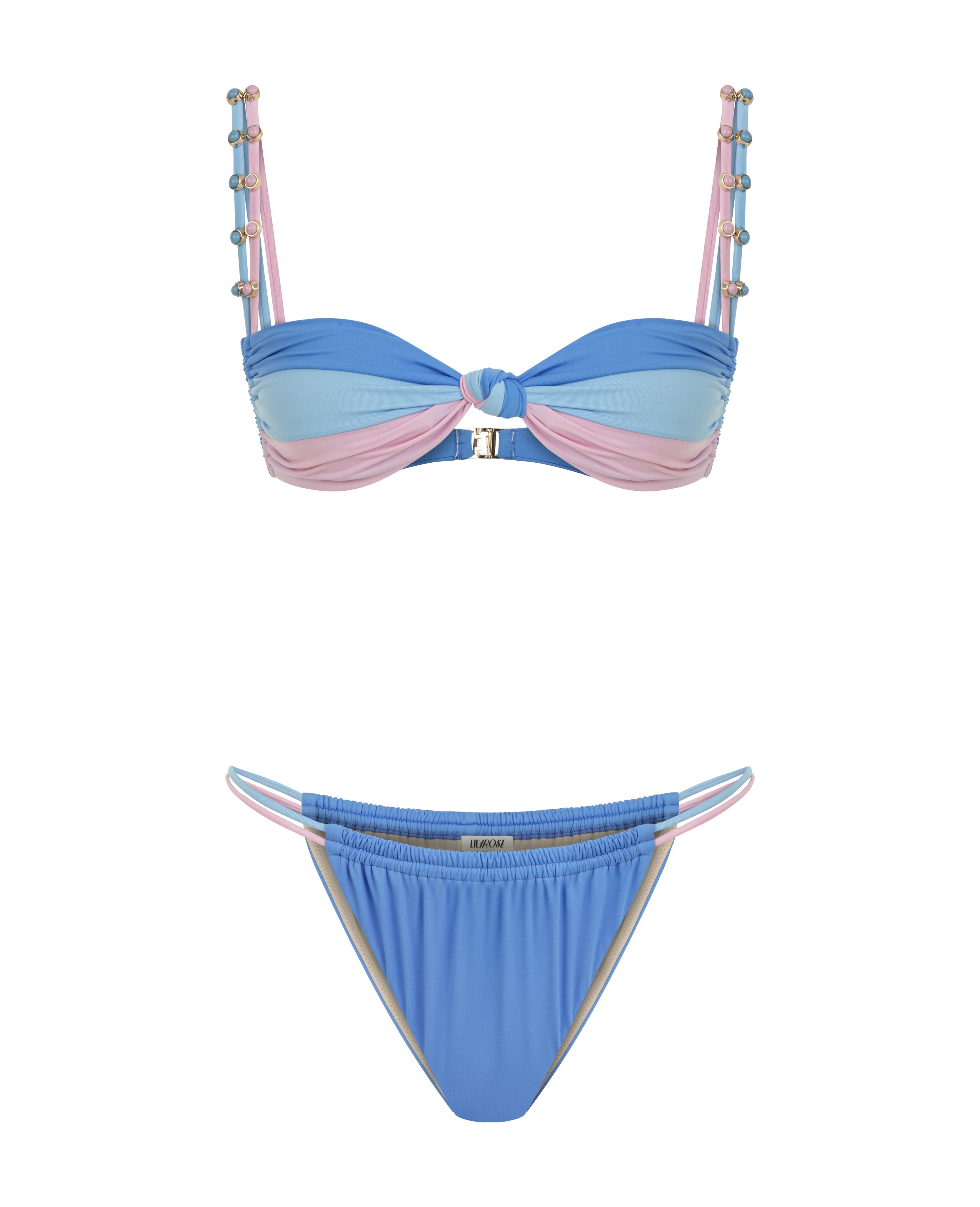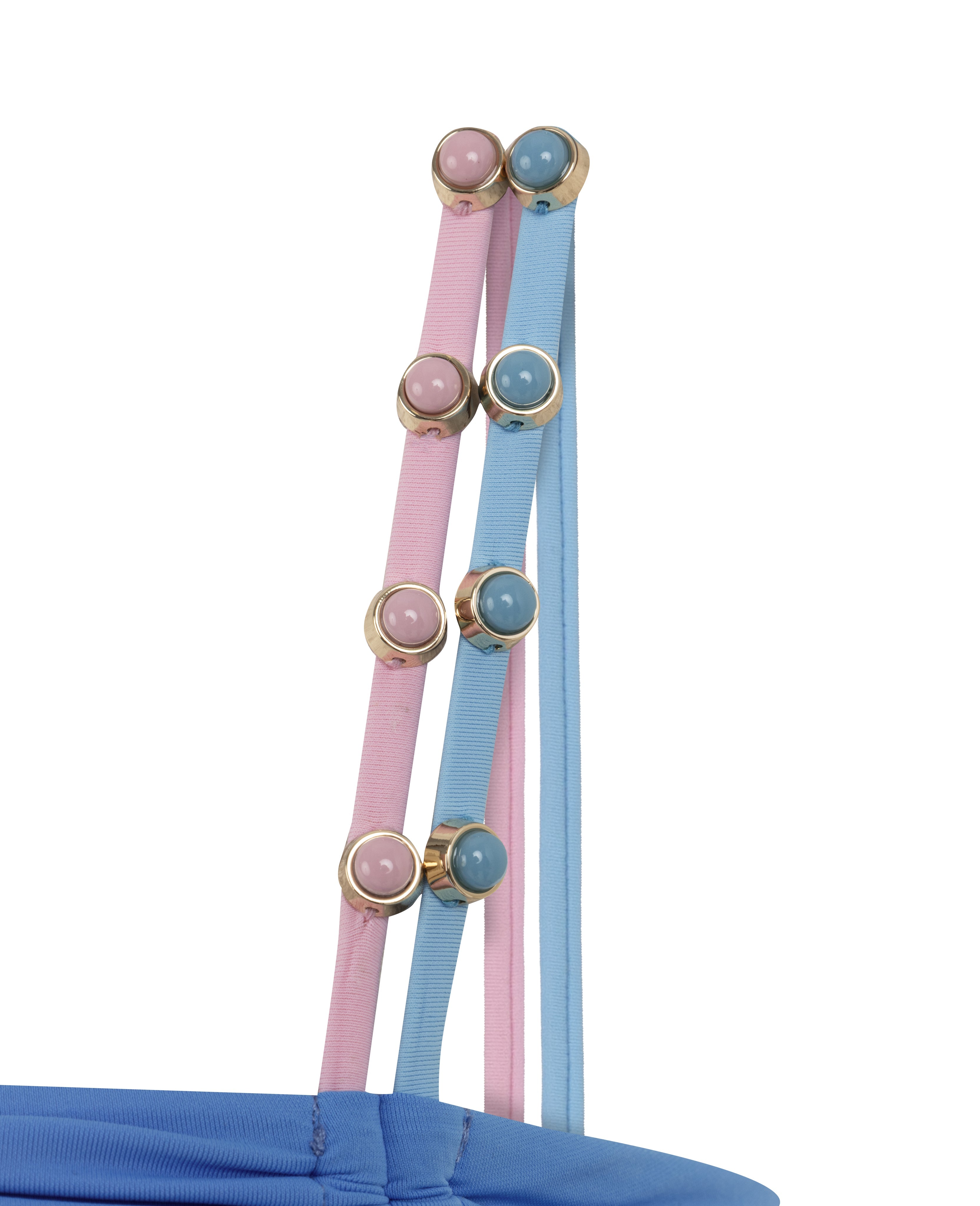 Colorblock blue-pink strapless bikini set with gold-plated accessories