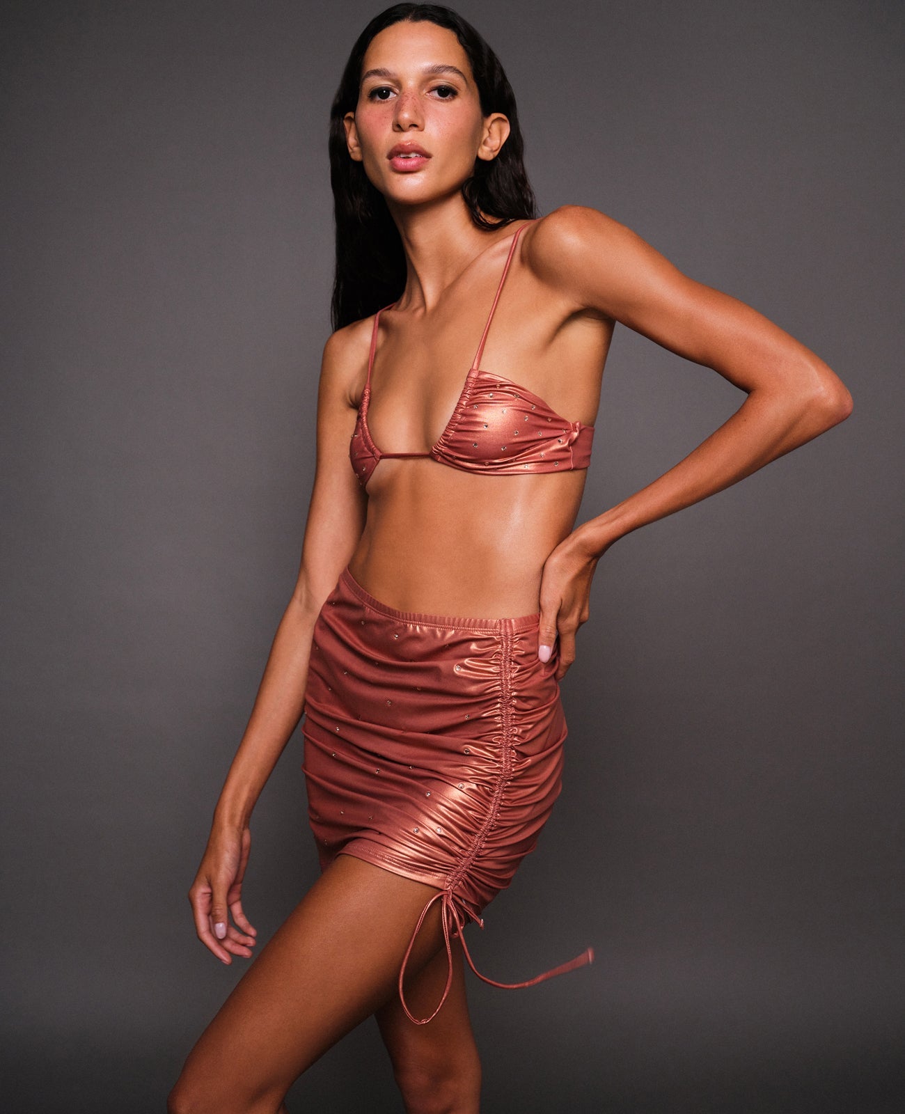 Ruched adjustable mini metallic cinnamon skirt embellished with premium crystals