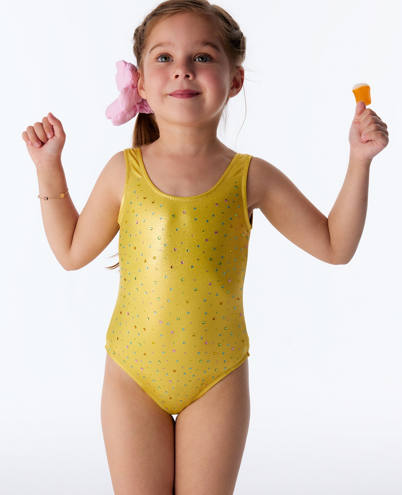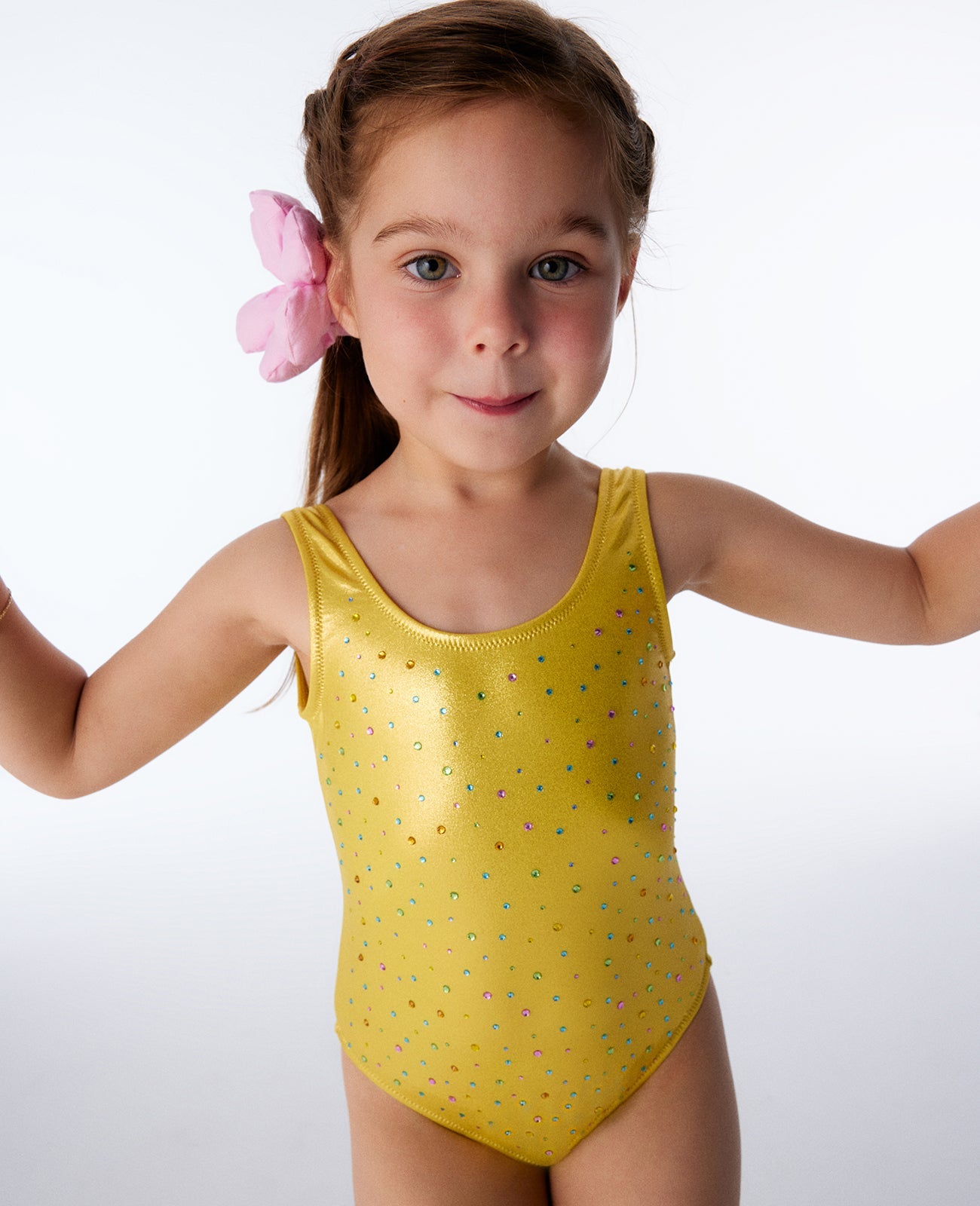Square neck open back metallic yellow kids swisuit embellished with crystals
