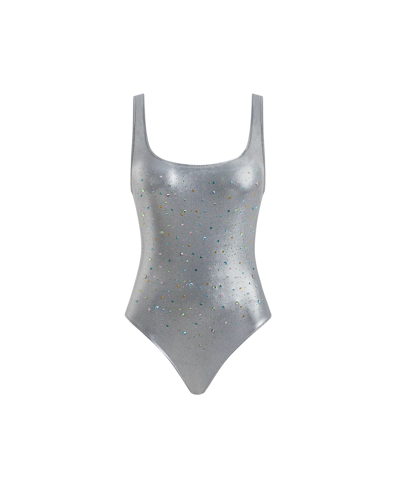 Square neck open back metallic swimsuit embellished with crystals
