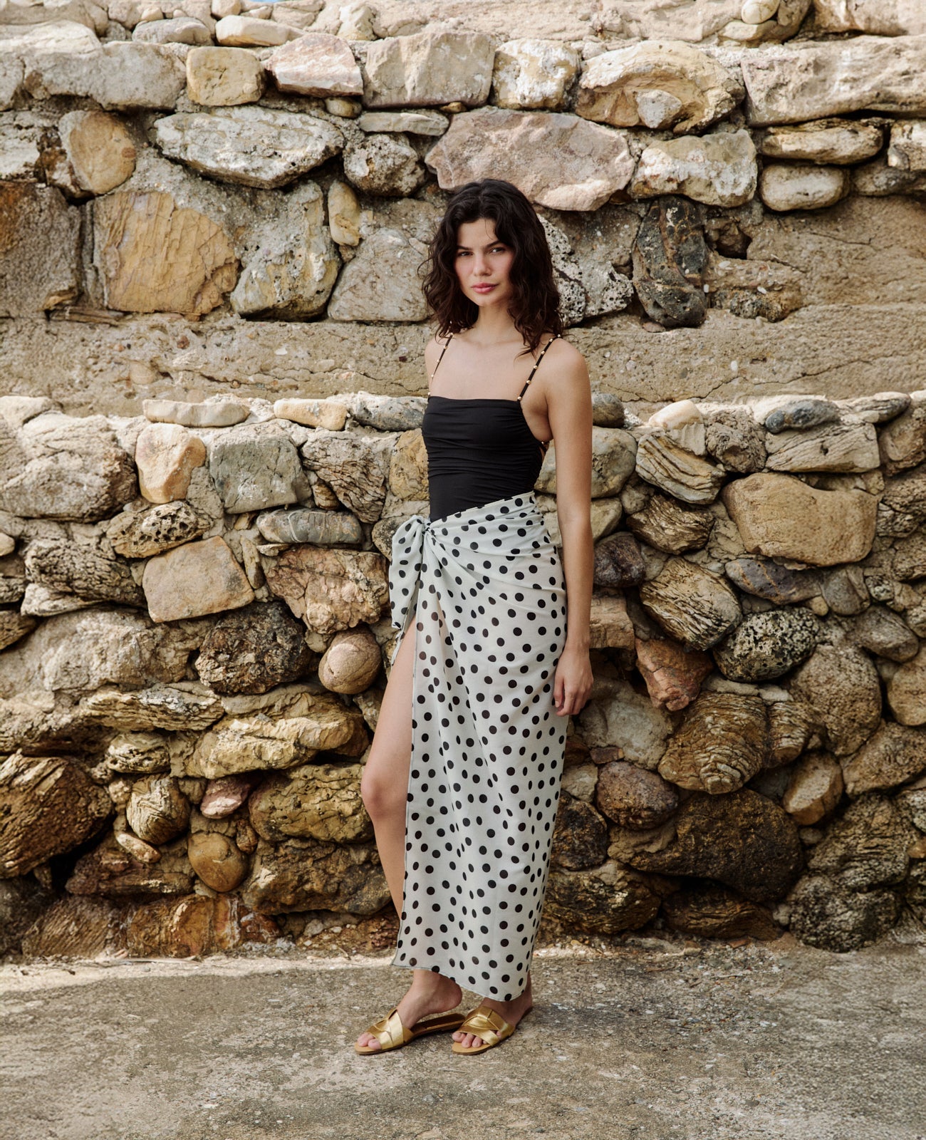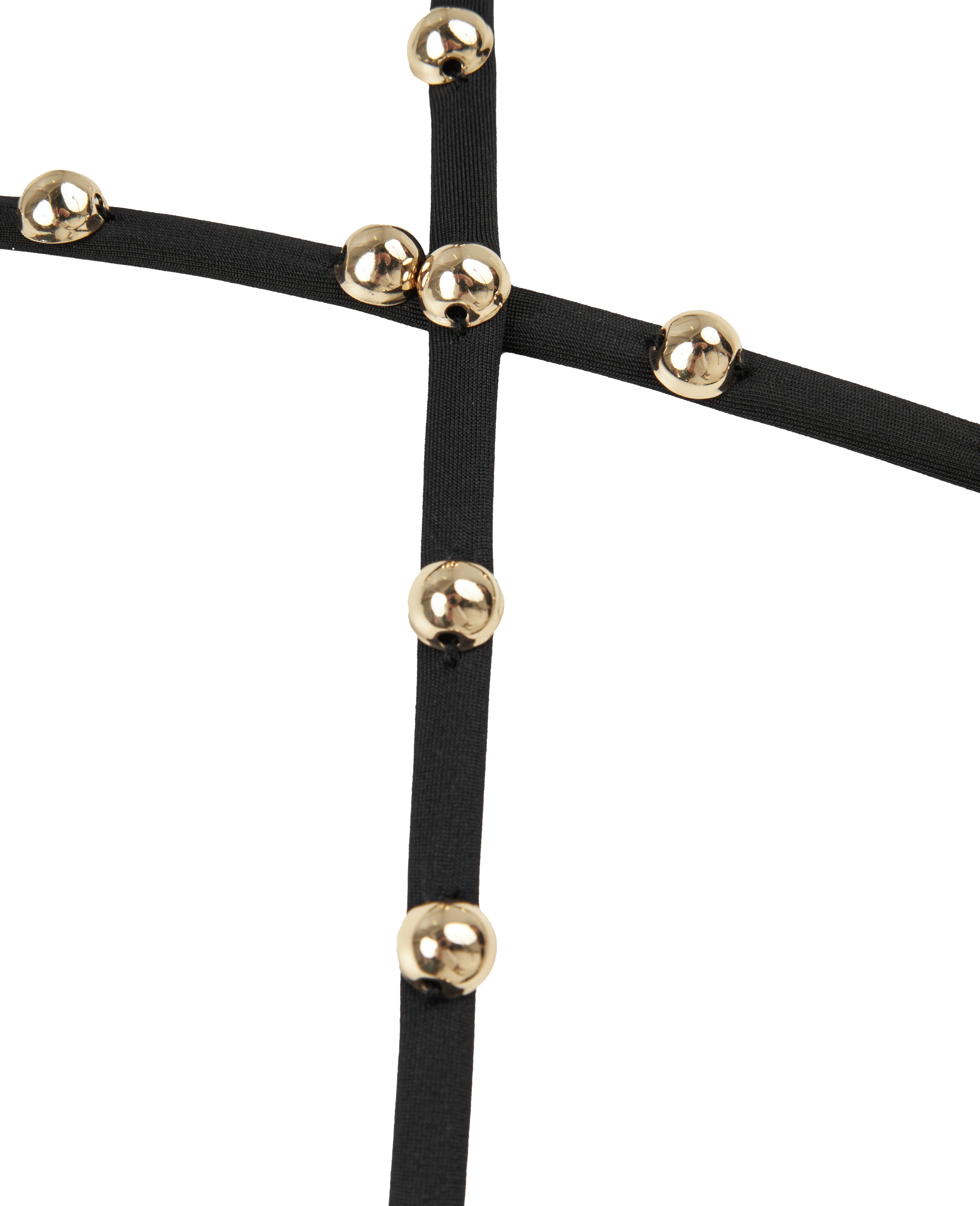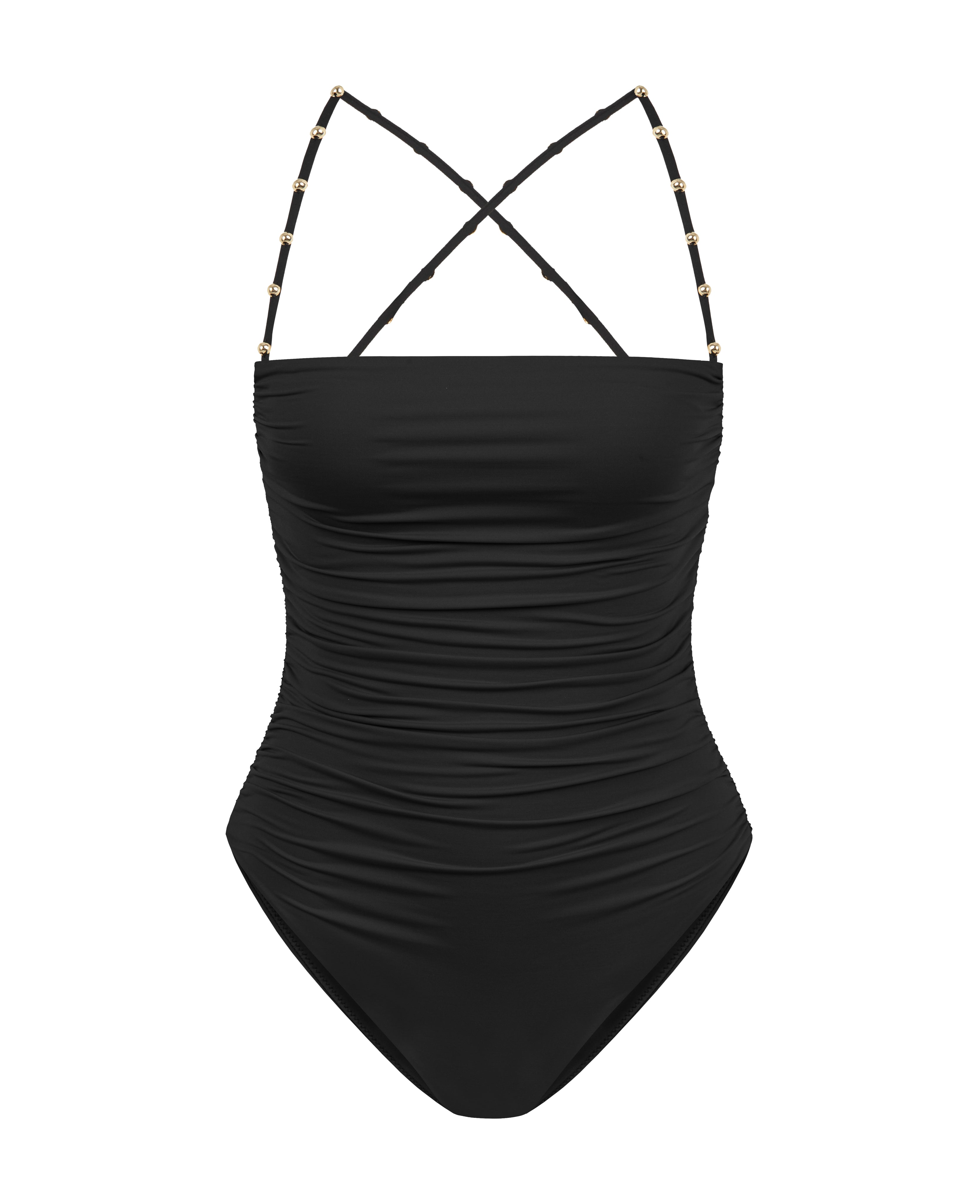 Ruched tie-detailed black swimsuit with gold-plated accessories