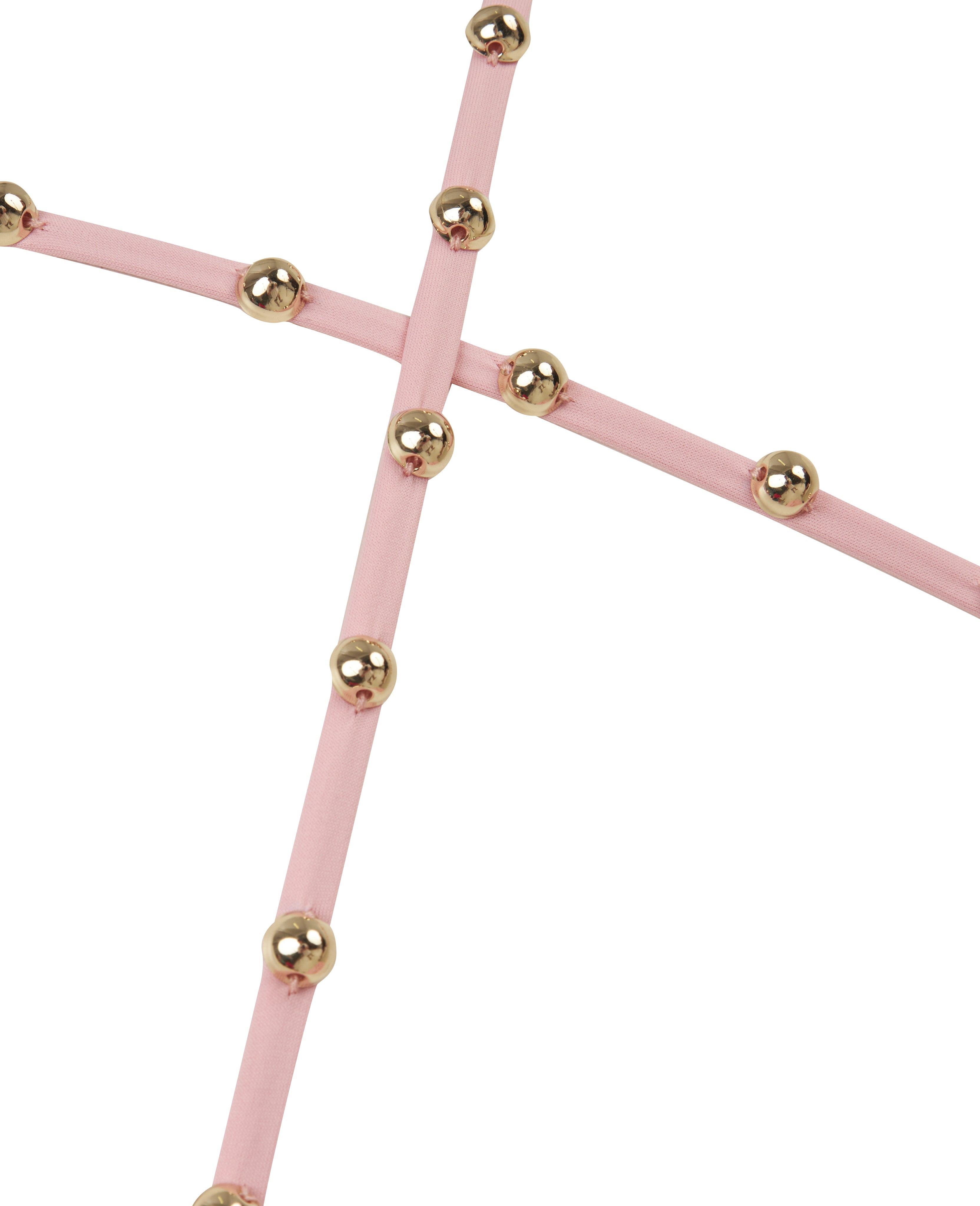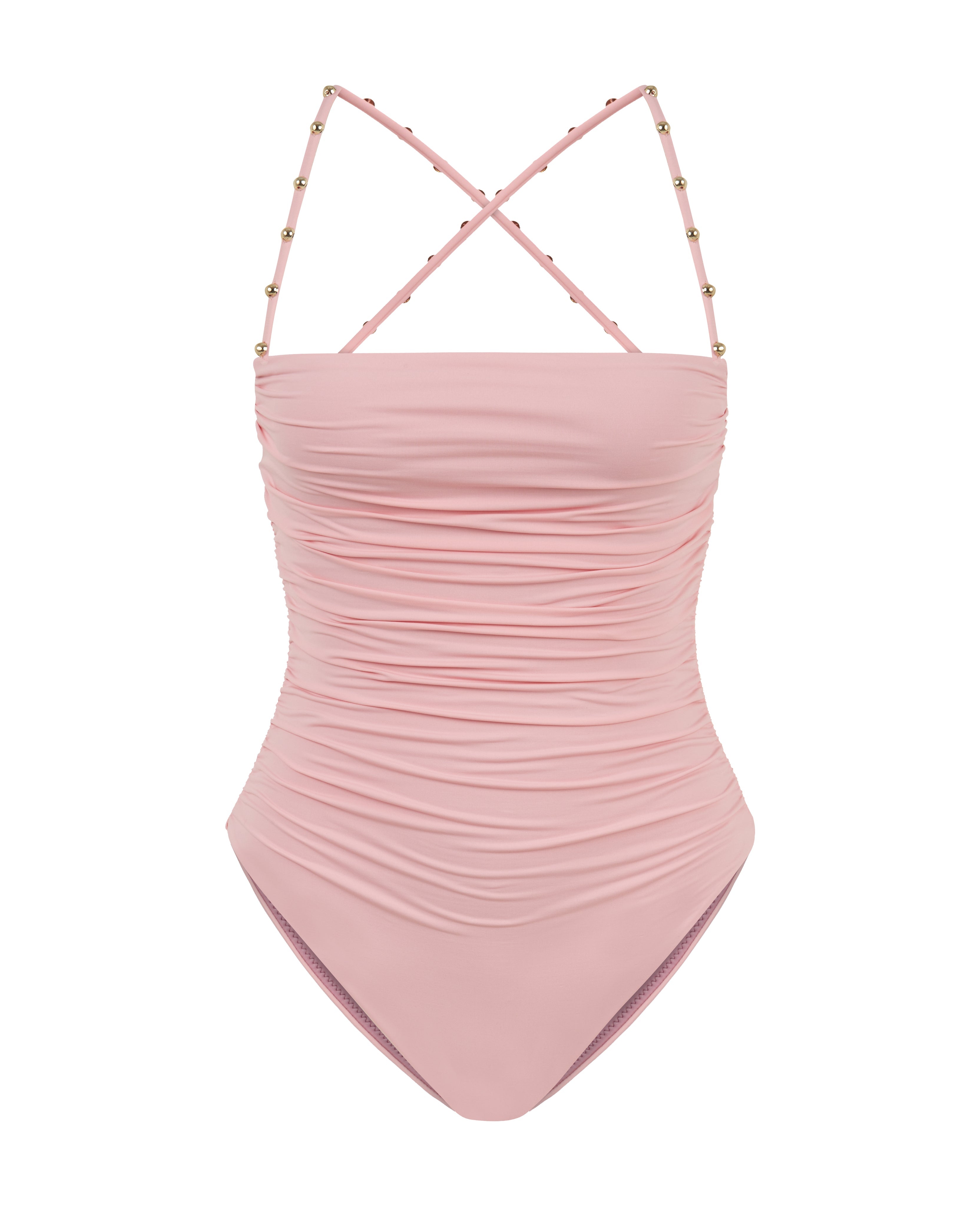 Ruched tie-detailed pink swimsuit with gold-plated accessories
