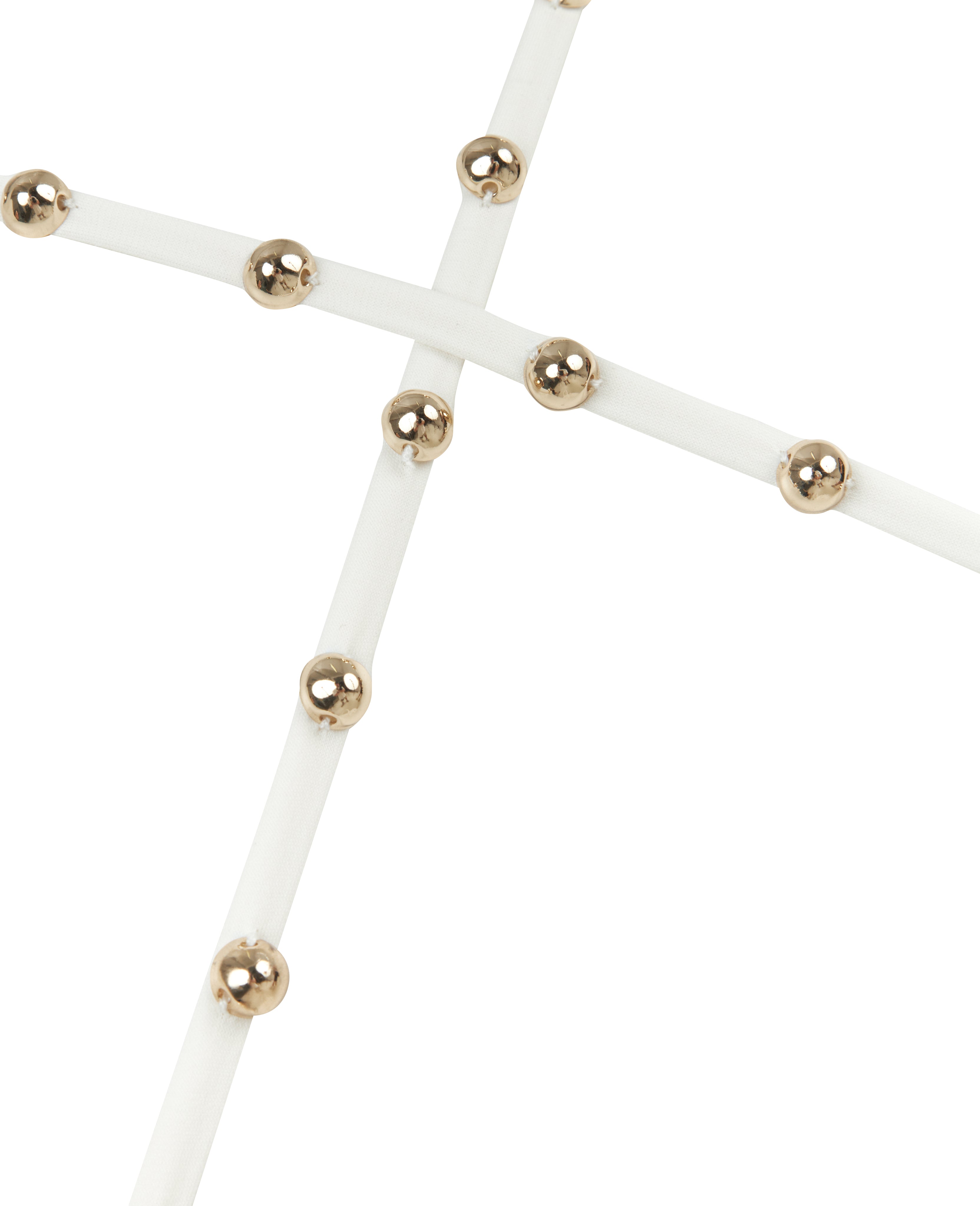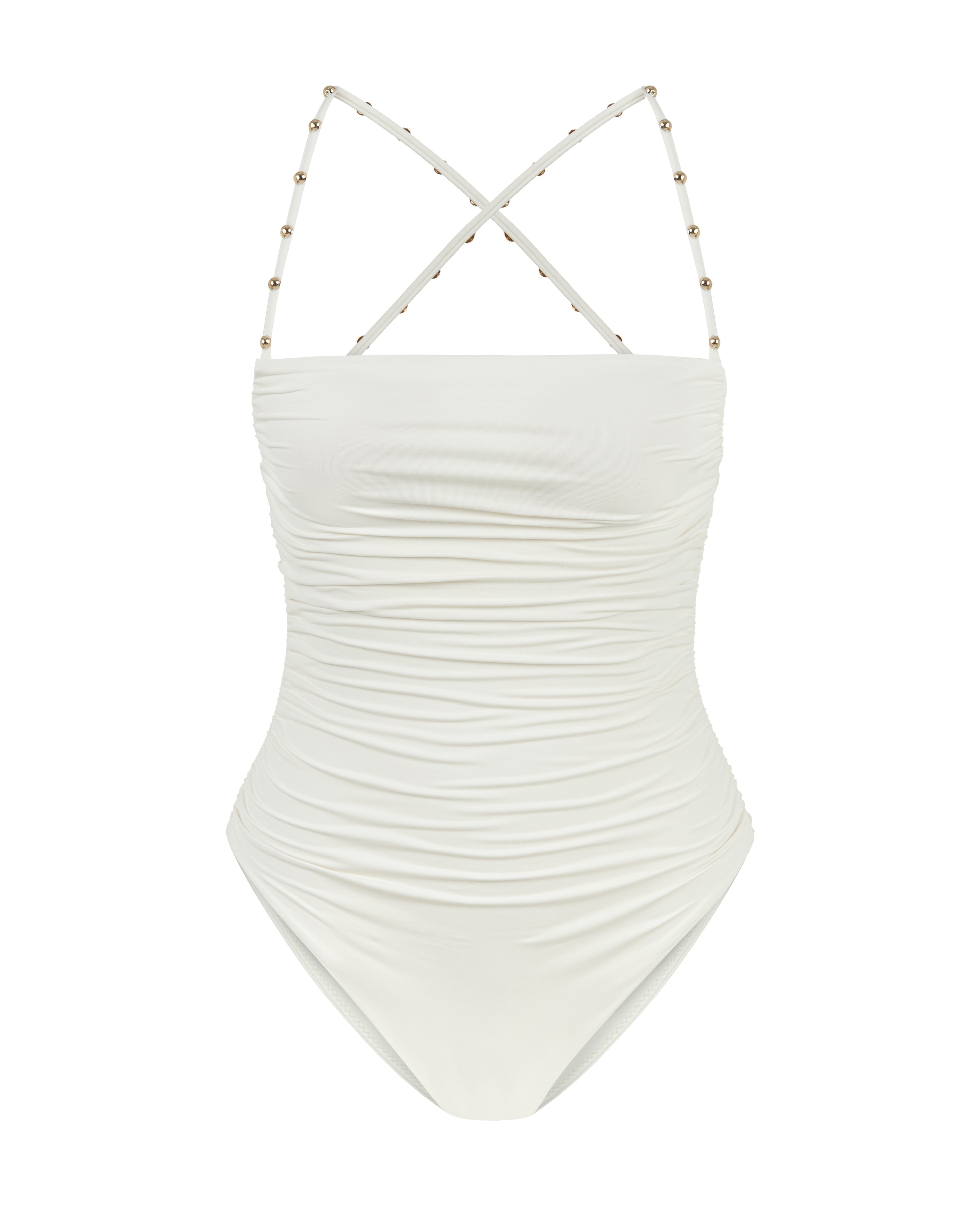 Ruched tie-detailed cream swimsuit with gold-plated accessories