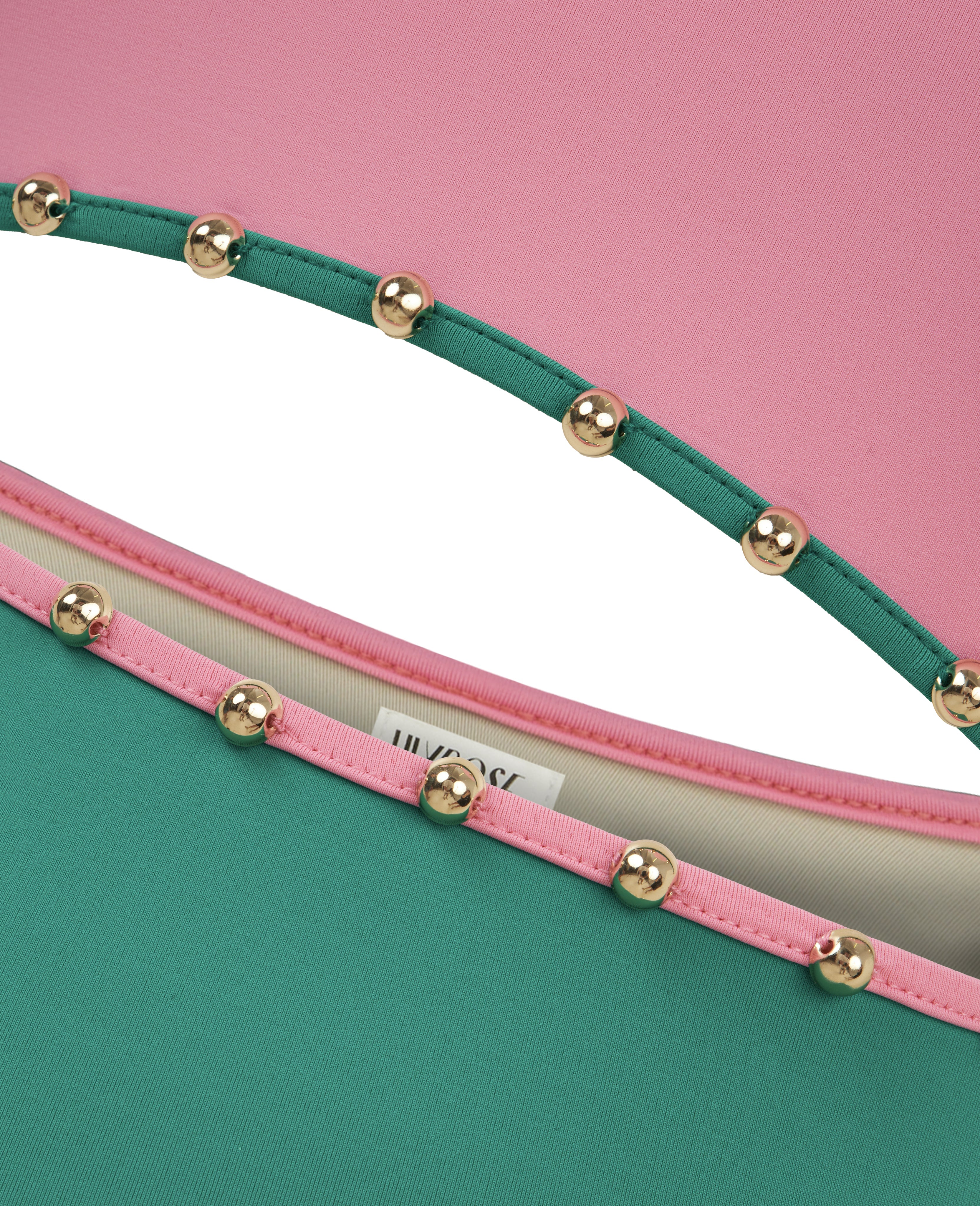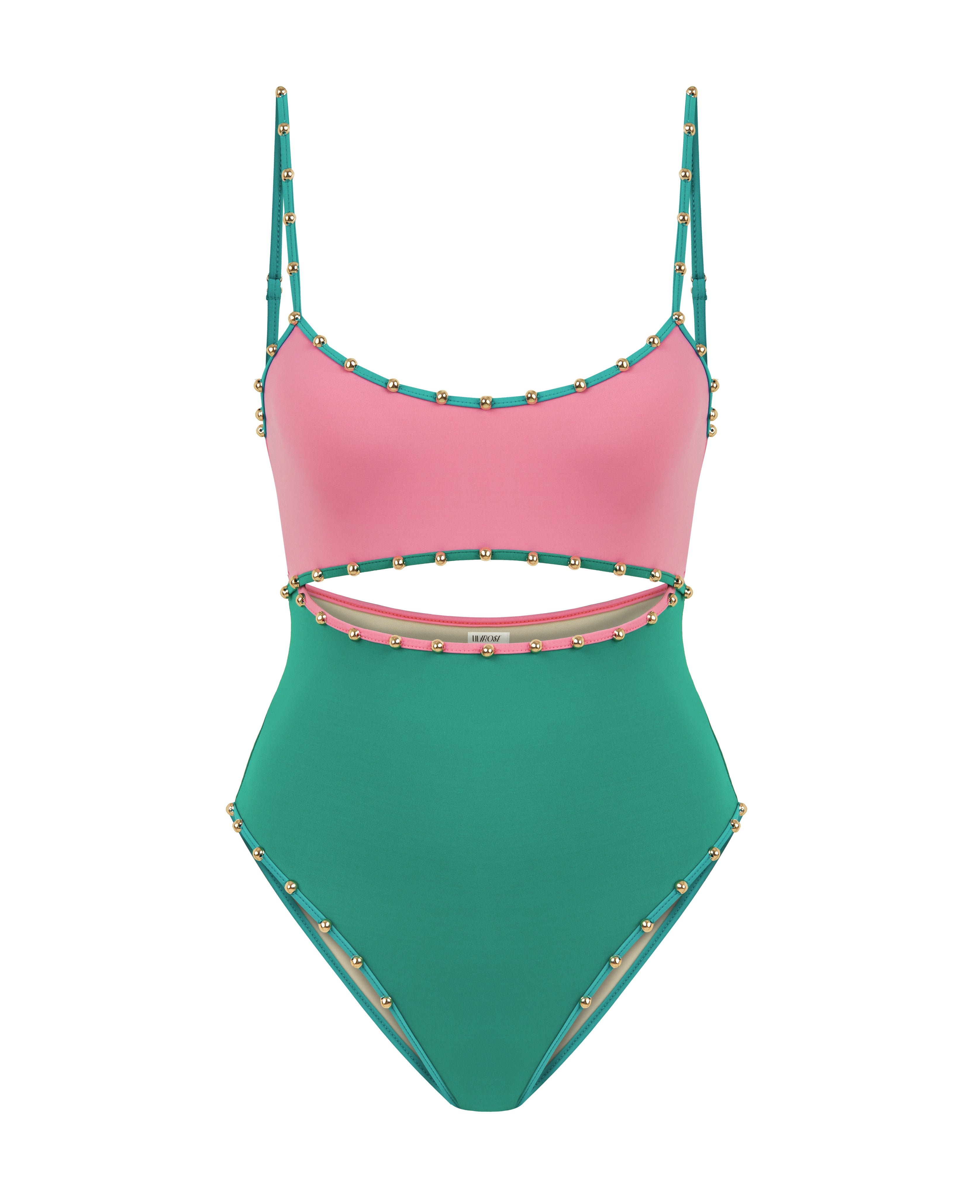 Colorblock pink-green cutout swimsuit with gold-plated accessories