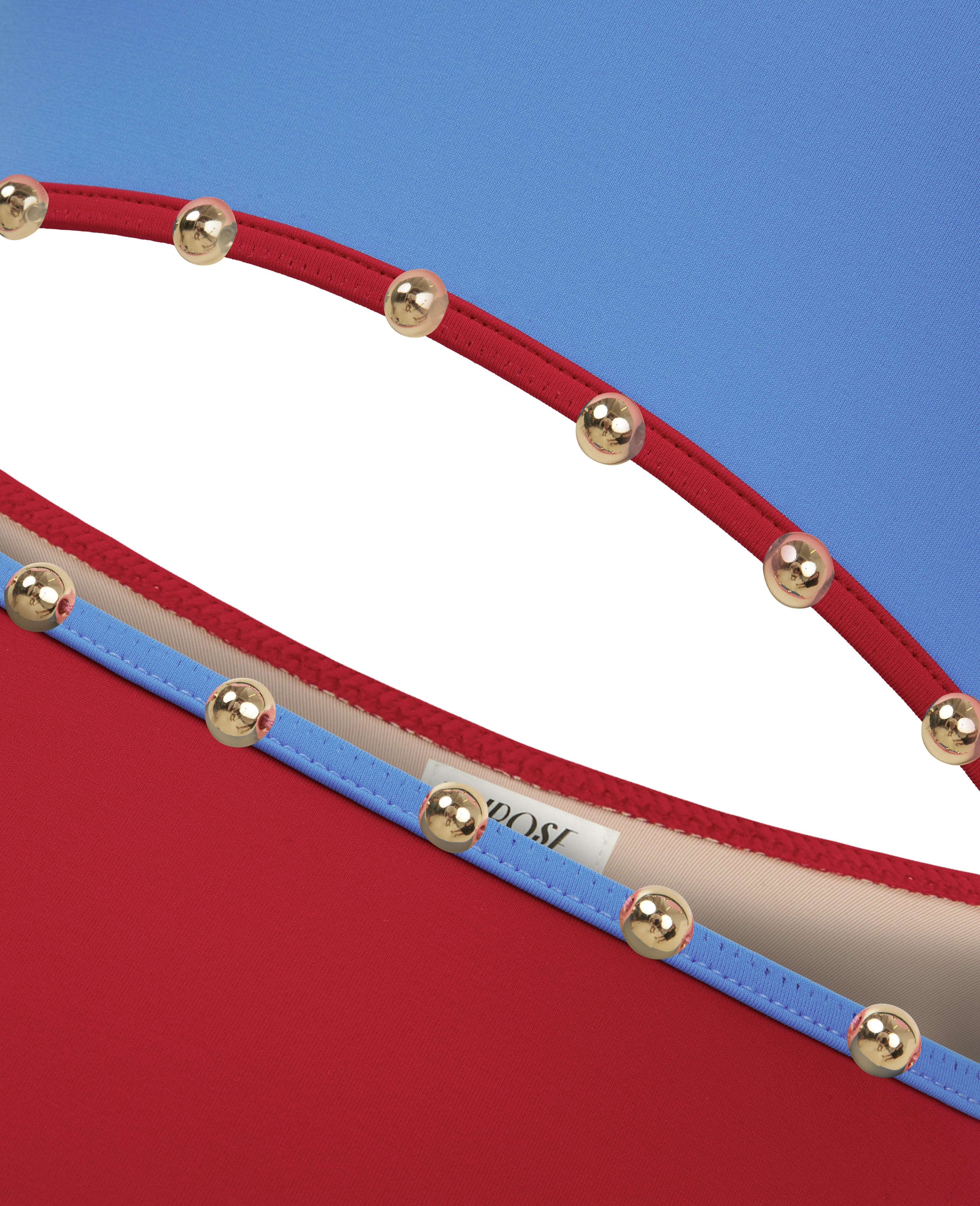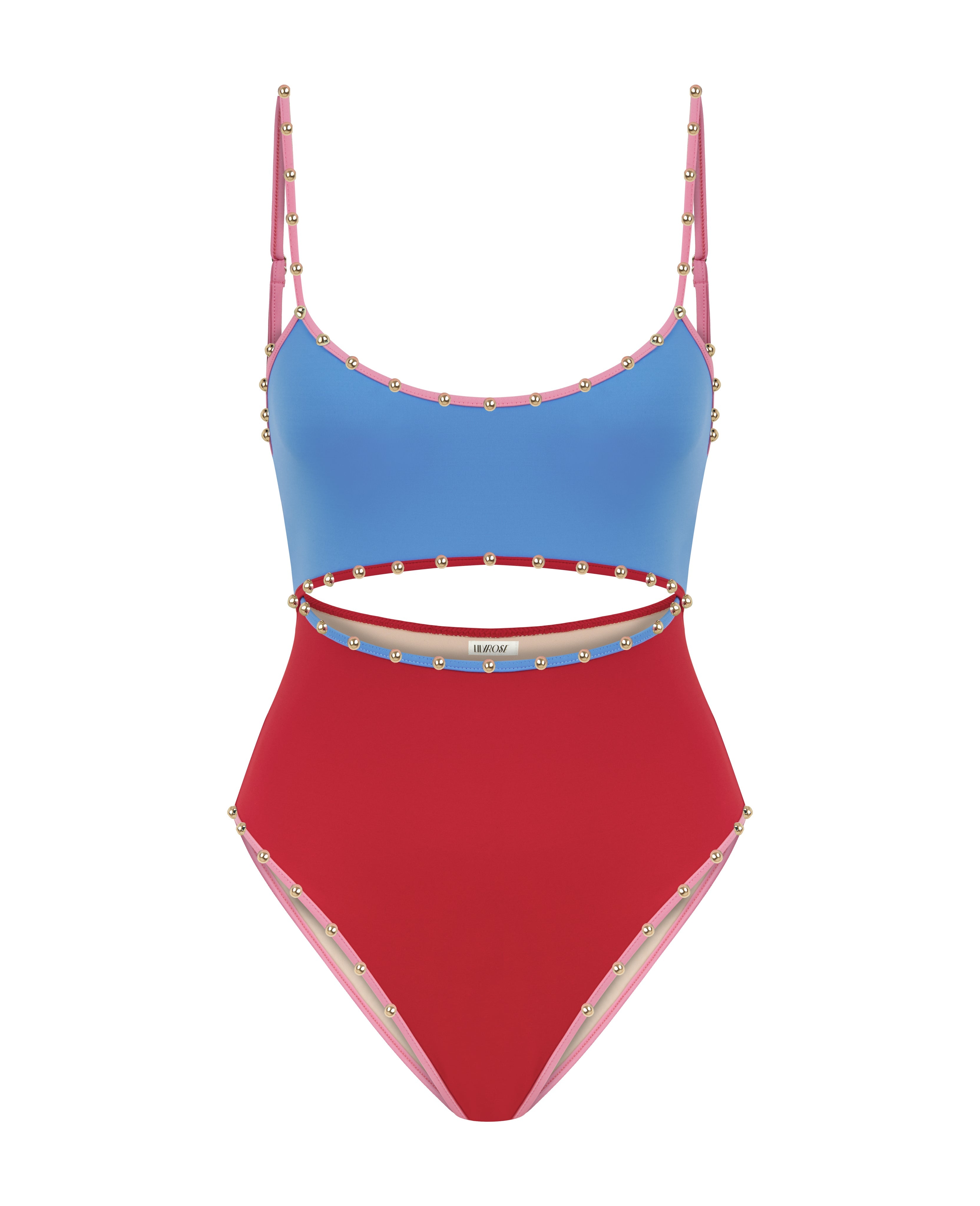 Colorblock blue-red cutout swimsuit with gold-plated accessories