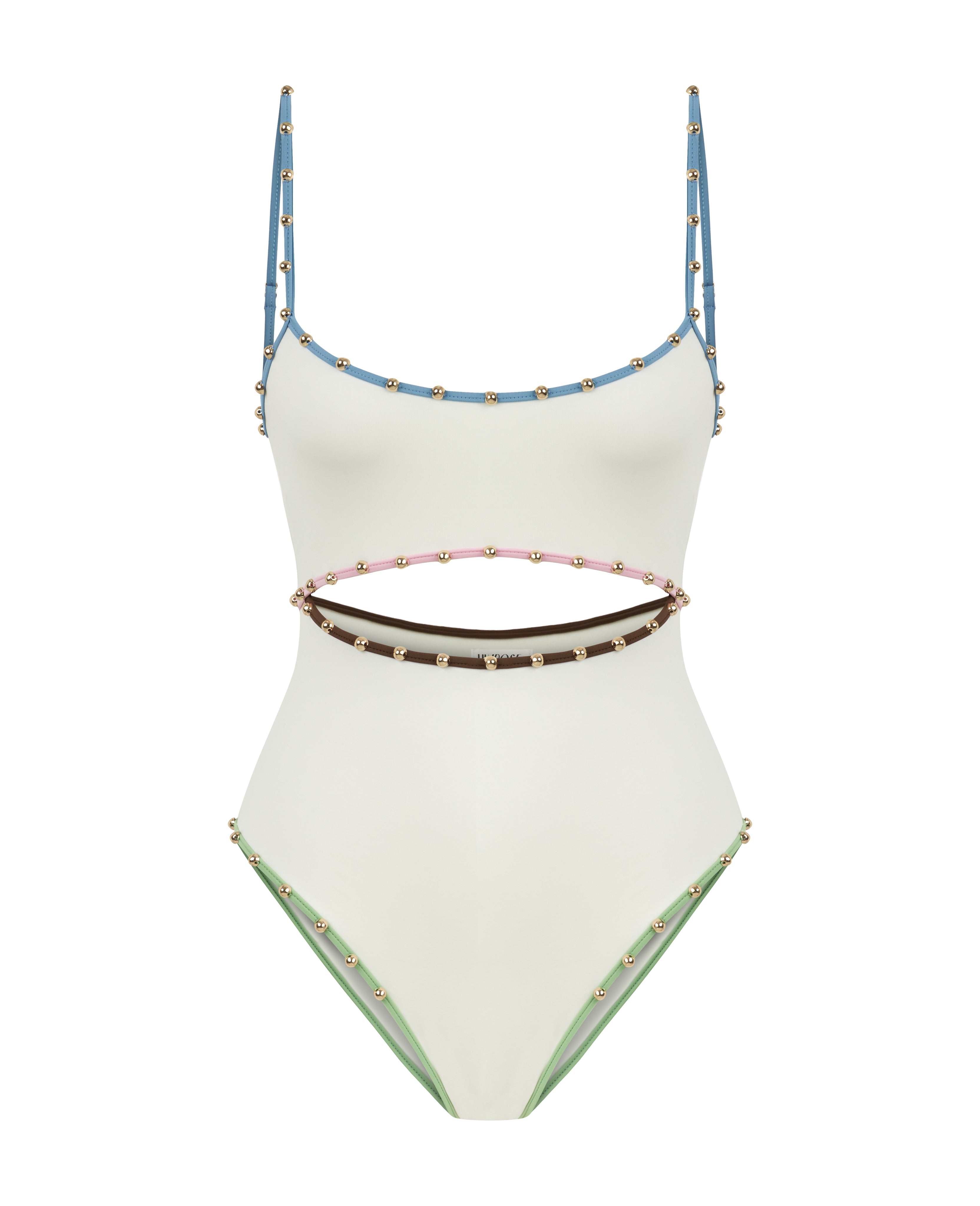 Colorblock cream cutout swimsuit with gold-plated accessories
