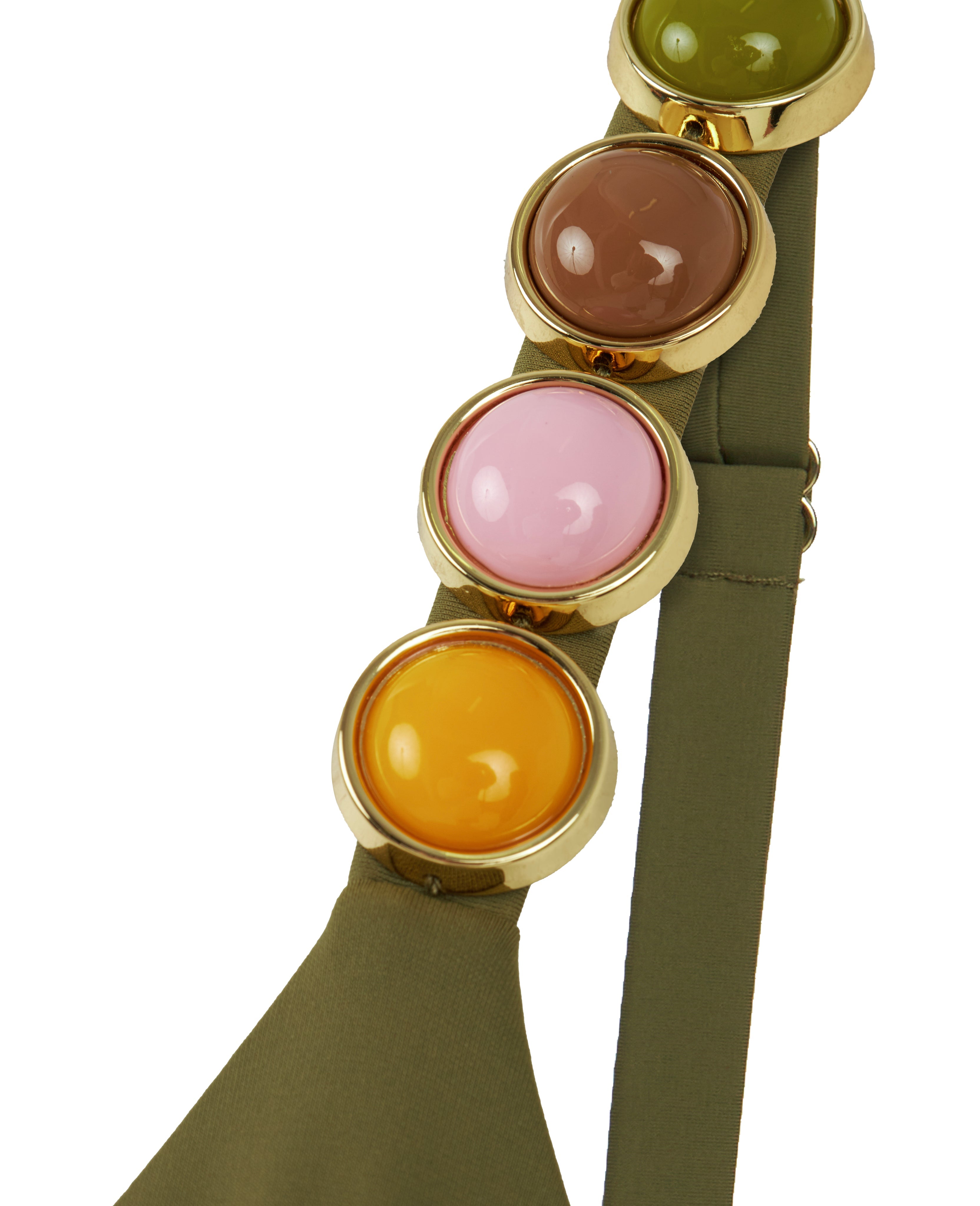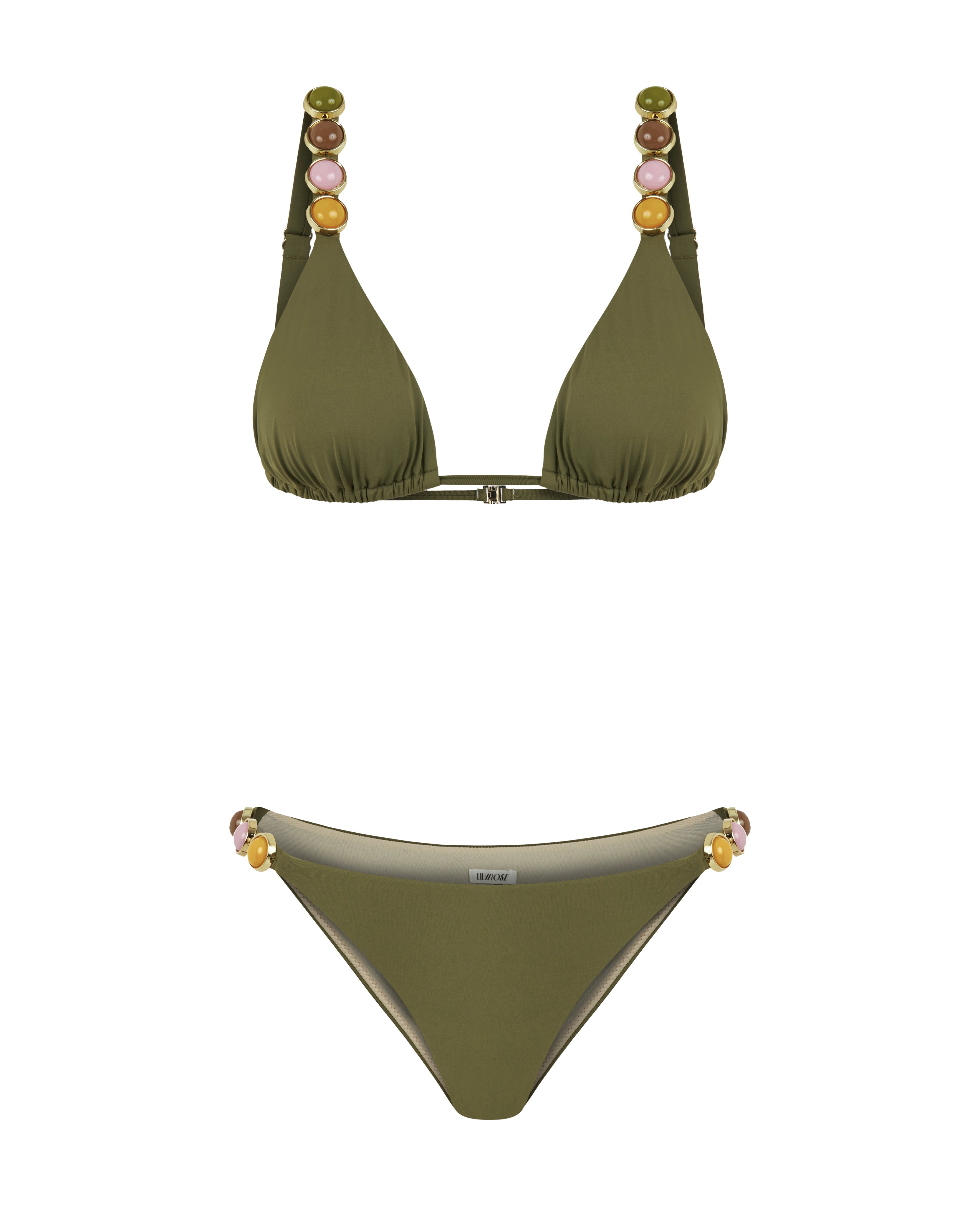 Triangle khaki bikini set with gold-plated multicolor accessories