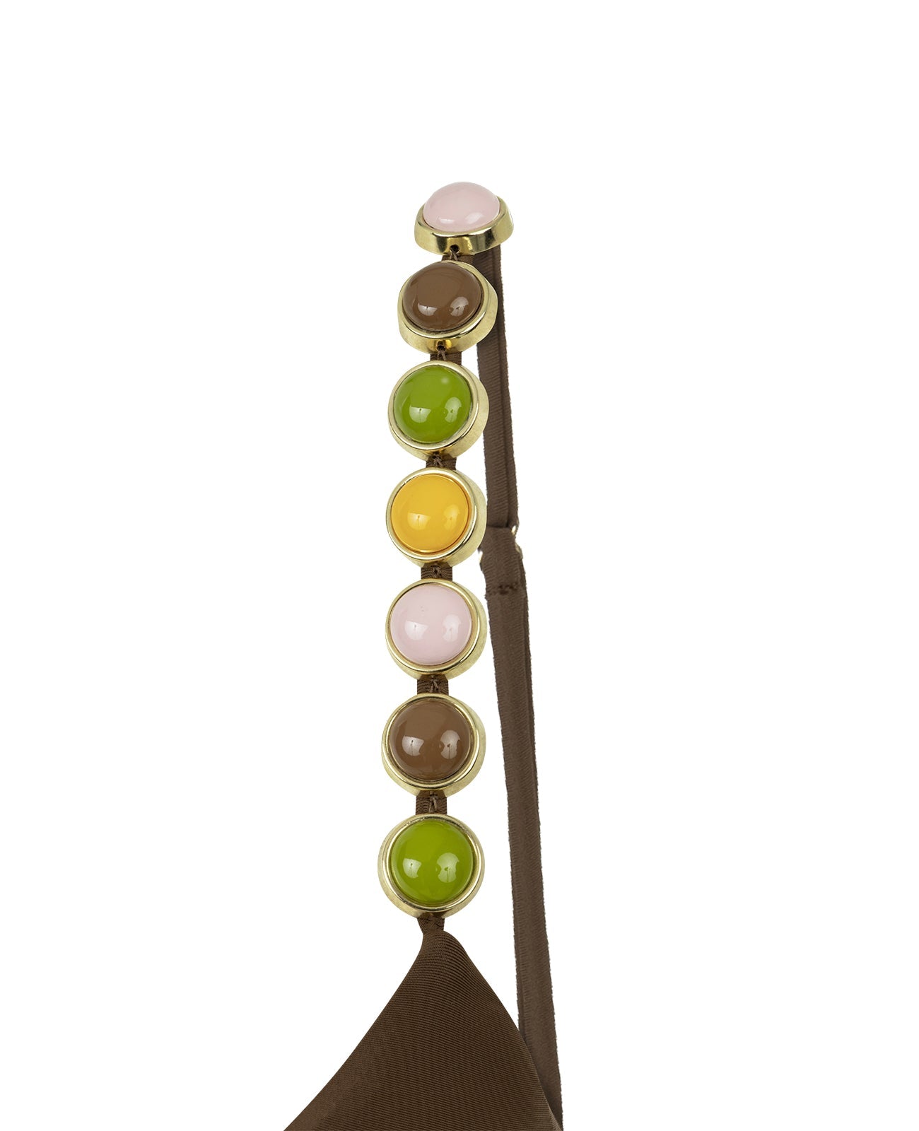 Ruched brown swimsuit with gold-plated multicolor accessories