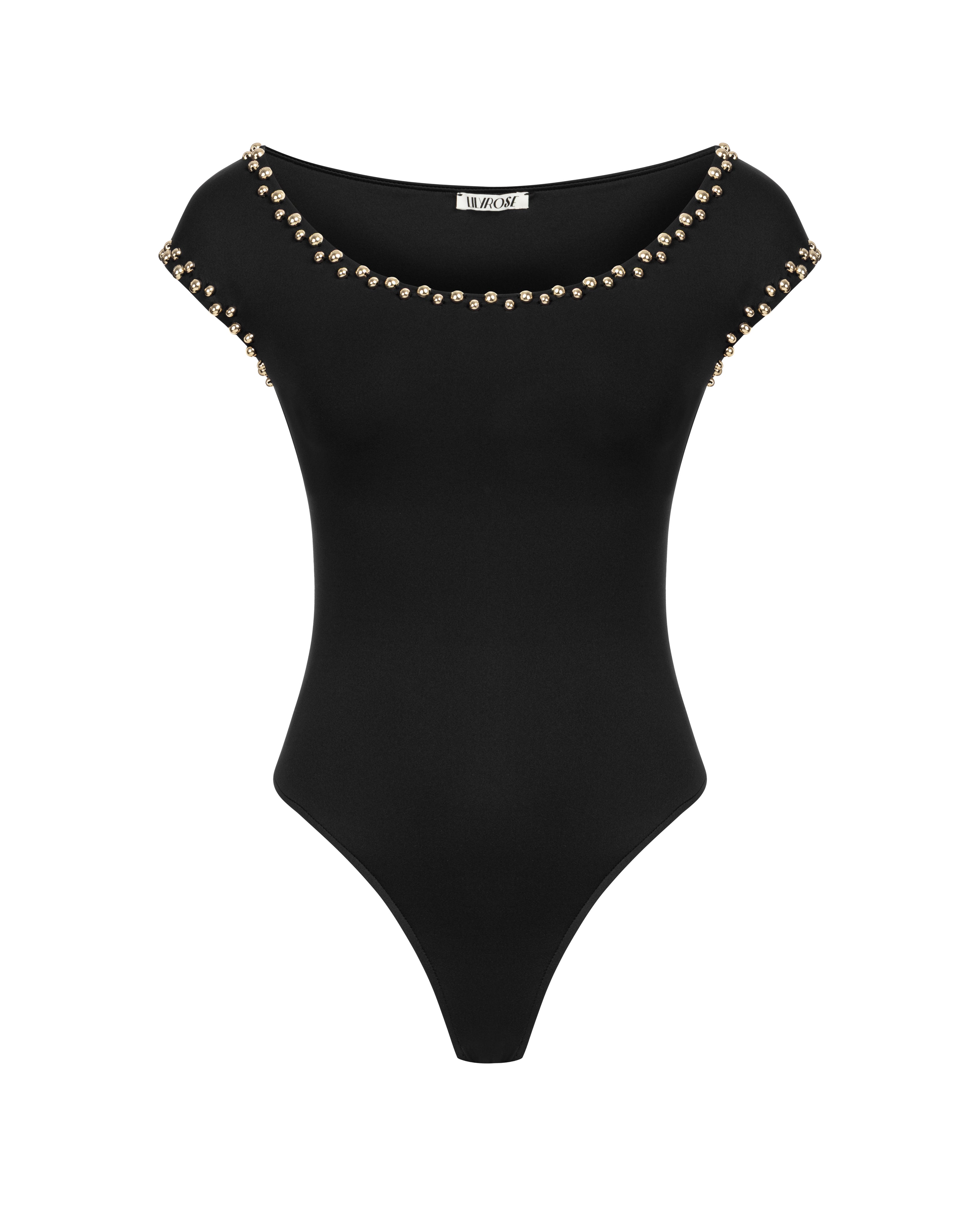 Bateau neck black bodysuit with gold-plated accessories
