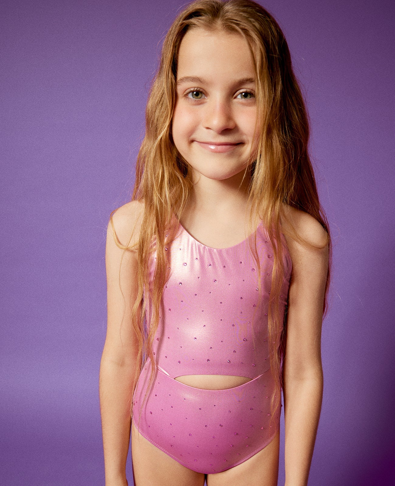 Cut-out metallic pink kids swimsuit embellished with crystals